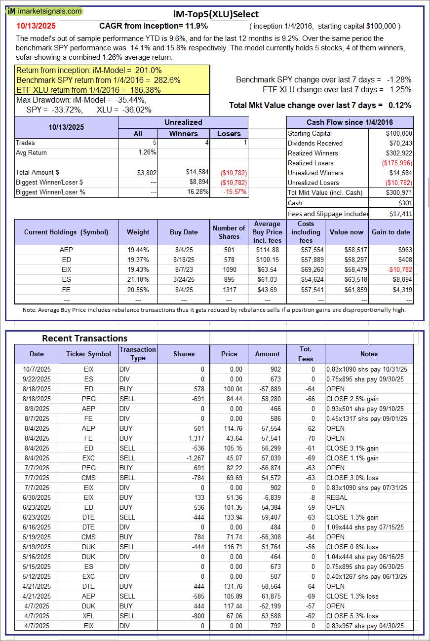 iM-Top5(XLU)Select: Since inception, on 1/5/2016, the model gained 200.97% while the benchmark SPY gained 282.60% over the same period. Over the previous week the market value of iM-Top5(XLU)Select gained 0.12% at a time when SPY gained -1.28%. A starting capital of $100,000 at inception on 1/5/2016 would have grown to $300,971 which includes $301 cash and excludes $17,411 spent on fees and slippage. |