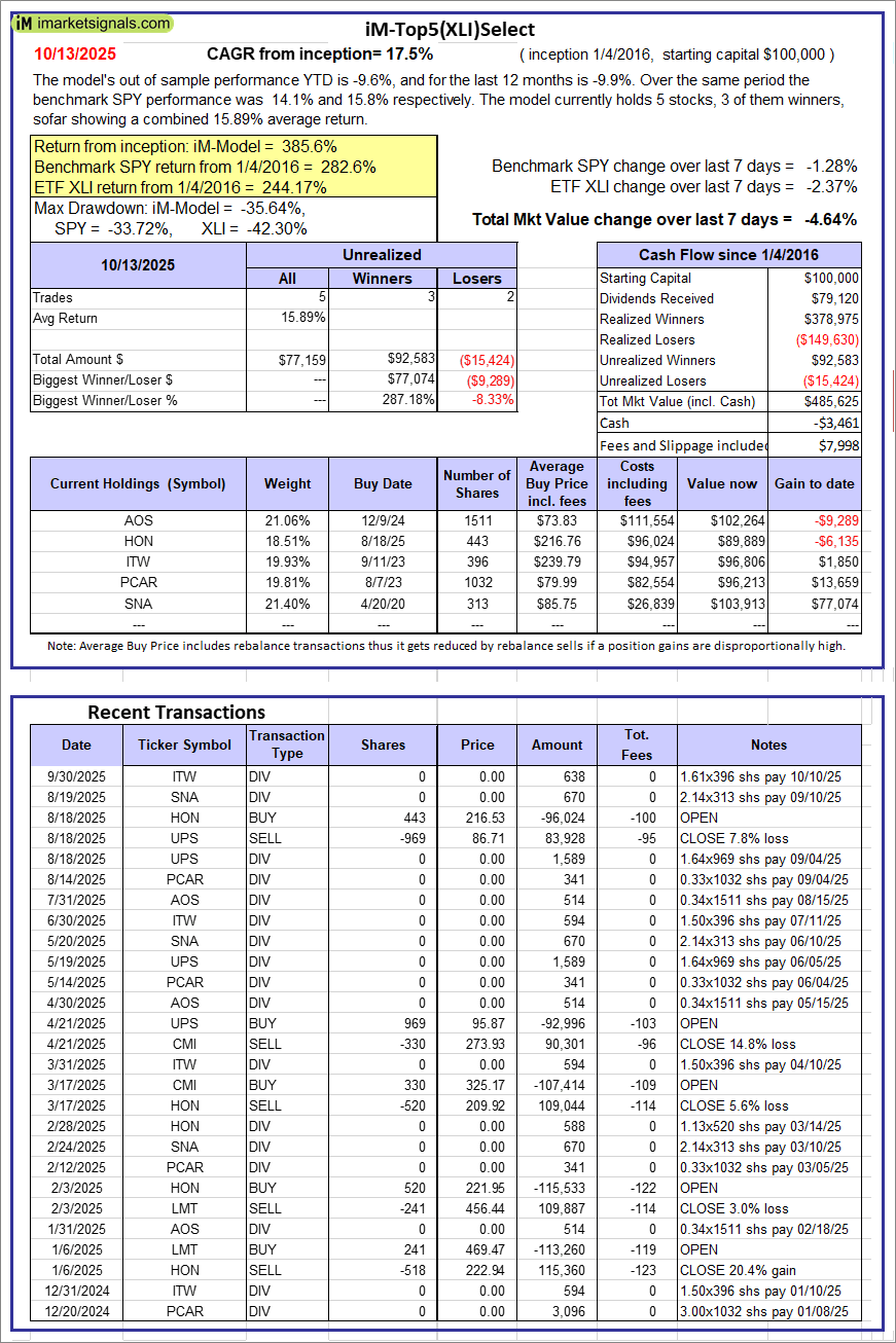 iM-Top5(XLI)Select: Since inception, on 1/5/2016, the model gained 385.62% while the benchmark SPY gained 282.60% over the same period. Over the previous week the market value of iM-Top5(XLI)Select gained -4.64% at a time when SPY gained -1.28%. A starting capital of $100,000 at inception on 1/5/2016 would have grown to $485,625 which includes -$3,461 cash and excludes $7,998 spent on fees and slippage. |