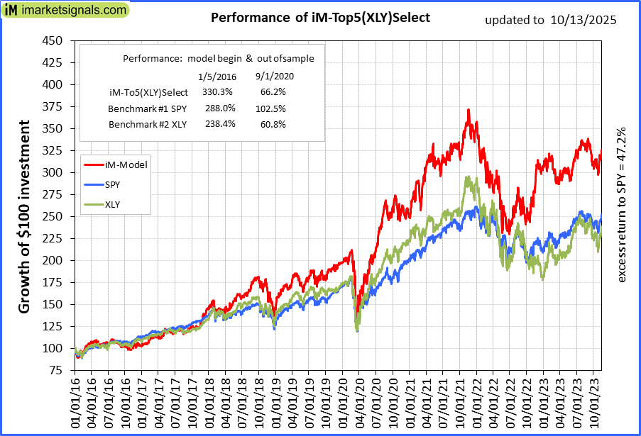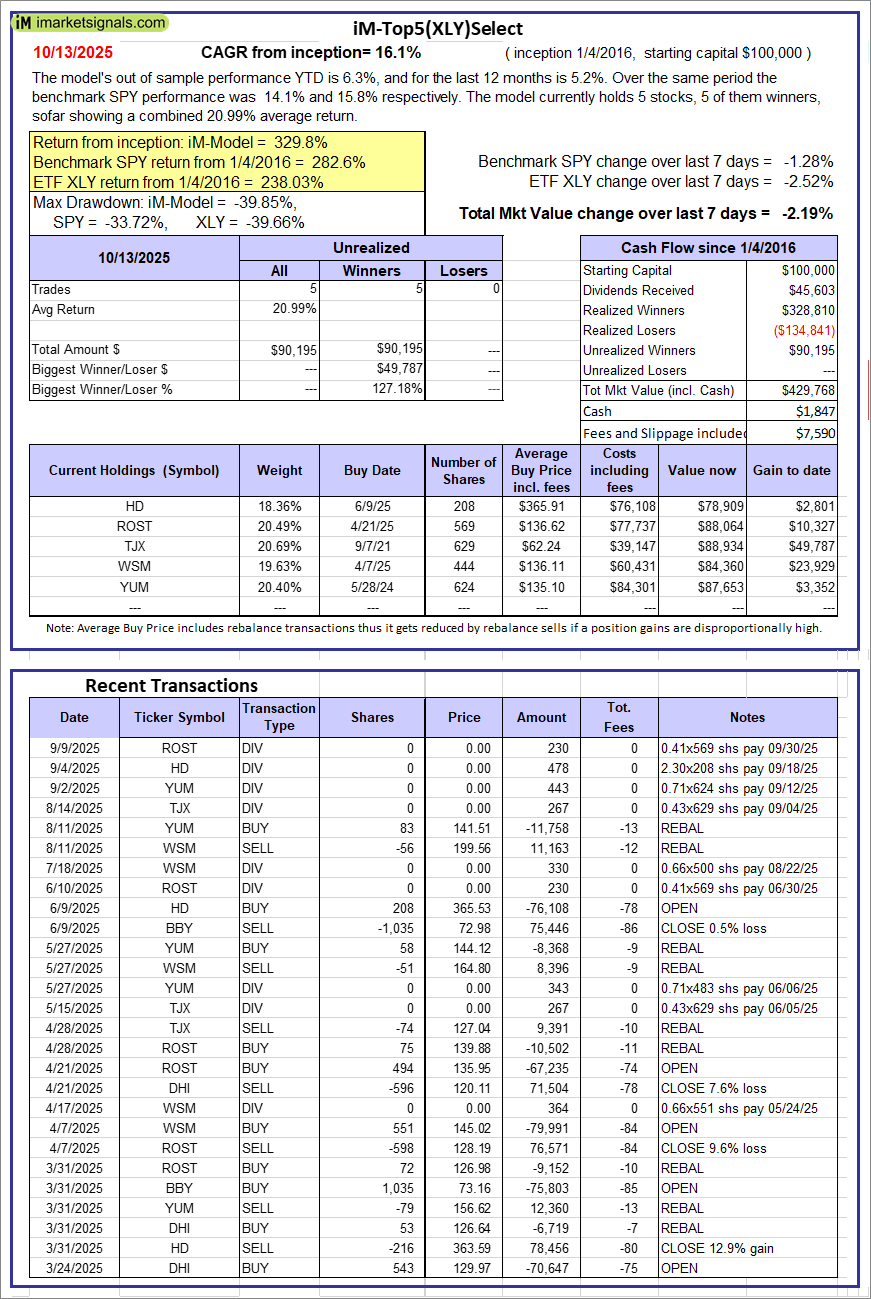 iM-Top5(XLY)Select: Since inception, on 1/5/2016, the model gained 329.77% while the benchmark SPY gained 282.60% over the same period. Over the previous week the market value of iM-Top5(XLY)Select gained -2.19% at a time when SPY gained -1.28%. A starting capital of $100,000 at inception on 1/5/2016 would have grown to $429,768 which includes $1,847 cash and excludes $7,590 spent on fees and slippage. |