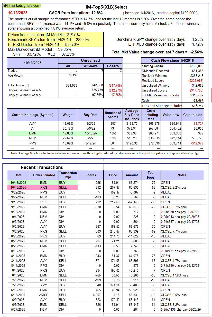 iM-Top5(XLB)Select: Since inception, on 1/5/2016, the model gained 219.48% while the benchmark SPY gained 282.60% over the same period. Over the previous week the market value of iM-Top5(XLB)Select gained -2.56% at a time when SPY gained -1.28%. A starting capital of $100,000 at inception on 1/5/2016 would have grown to $319,482 which includes -$1,437 cash and excludes $16,747 spent on fees and slippage. |