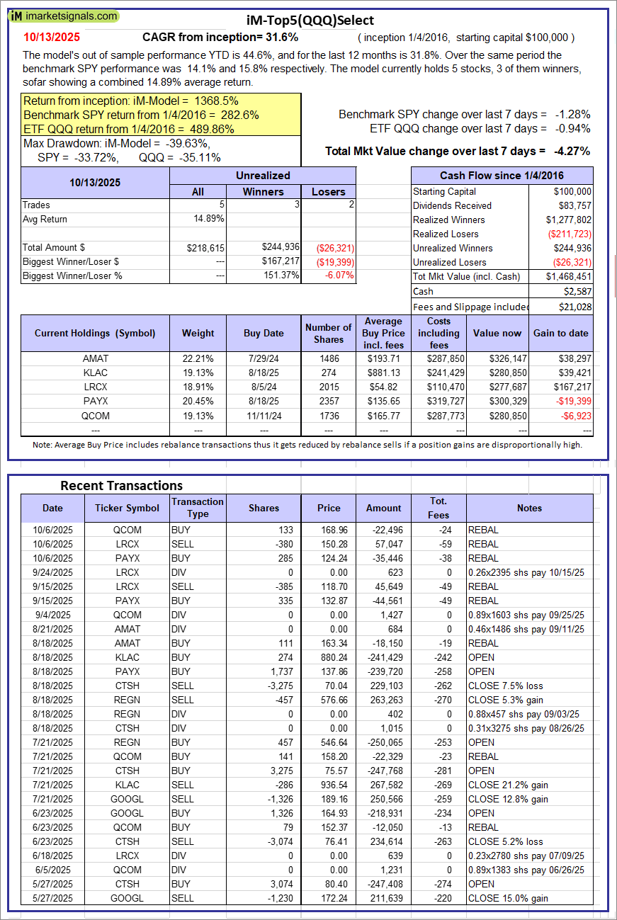 iM-Top5(QQQ)Select: Since inception, on 1/5/2016, the model gained 1368.45% while the benchmark SPY gained 282.60% over the same period. Over the previous week the market value of iM-Top5(QQQ)Select gained -4.27% at a time when SPY gained -1.28%. A starting capital of $100,000 at inception on 1/5/2016 would have grown to $1,468,451 which includes $2,587 cash and excludes $21,028 spent on fees and slippage. |