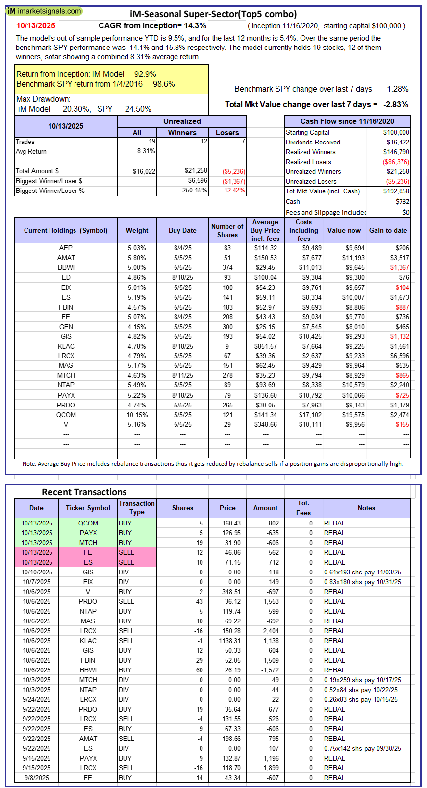 iM-Seasonal Super-Sectors (Top5 combo) : Since inception, on 11/17/2020, the model gained 92.86% while the benchmark SPY gained 98.61% over the same period. Over the previous week the market value of iM-Seasonal Super-Sectors (Top5 combo) gained -2.83% at a time when SPY gained -1.28%. A starting capital of $100,000 at inception on 11/17/2020 would have grown to $192,858 which includes $732 cash and excludes $00 spent on fees and slippage. |
