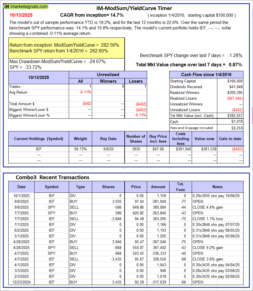 iM-ModSum/YieldCurve Timer: The model’s out of sample performance YTD is 19.2%, and for the last 12 months is 22.6%. Over the same period the benchmark SPY performance was 14.1% and 15.8% respectively. Over the previous week the market value of iM-PortSum/YieldCurve Timer gained 0.87% at a time when SPY gained -1.28%. A starting capital of $100,000 at inception on 1/1/2016 would have grown to $382,557 which includes $1,019 cash and excludes $2,213 spent on fees and slippage. |