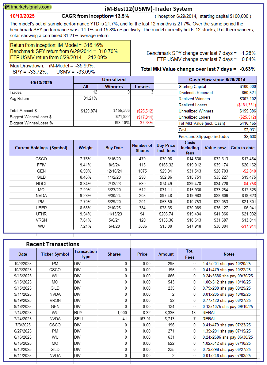 iM-Best12(USMV)-Trader: The model’s out of sample performance YTD is 21.7%, and for the last 12 months is 21.7%. Over the same period the benchmark SPY performance was 14.1% and 15.8% respectively. Since inception, on 6/30/2014, the model gained 316.16% while the benchmark SPY gained 310.70% and the ETF USMV gained 212.09% over the same period. Over the previous week the market value of iM-Best12(USMV)-Trader gained -0.63% at a time when SPY gained -1.28%. A starting capital of $100,000 at inception on 6/30/2014 would have grown to $416,165 which includes $2,931 cash and excludes $8,600 spent on fees and slippage. |