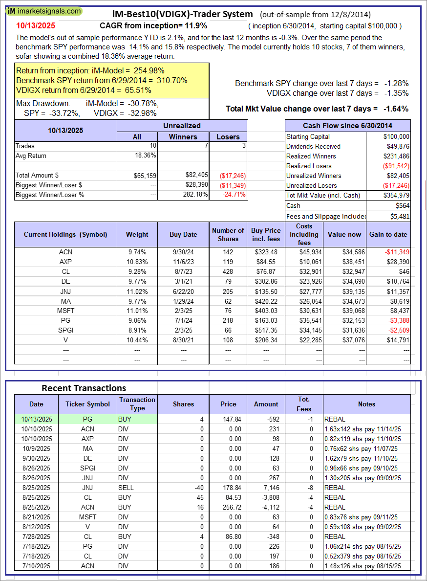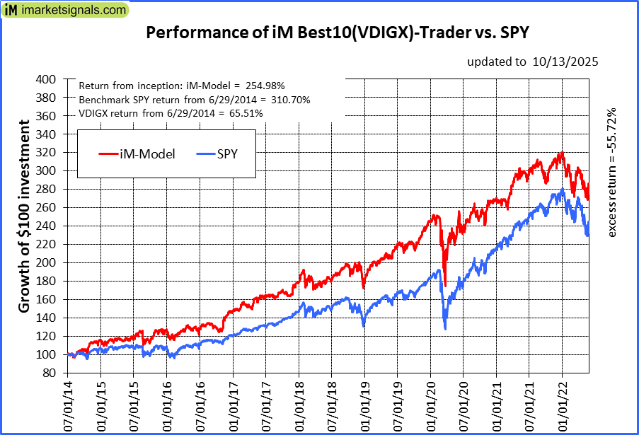 iM-Best10(VDIGX)-Trader: The model’s out of sample performance YTD is 2.1%, and for the last 12 months is -0.3%. Over the same period the benchmark SPY performance was 14.1% and 15.8% respectively. Since inception, on 7/1/2014, the model gained 254.98% while the benchmark SPY gained 310.70% and VDIGX gained 65.51% over the same period. Over the previous week the market value of iM-Best10(VDIGX) gained -1.64% at a time when SPY gained -1.28%. A starting capital of $100,000 at inception on 7/1/2014 would have grown to $354,979 which includes $564 cash and excludes $5,481 spent on fees and slippage. |