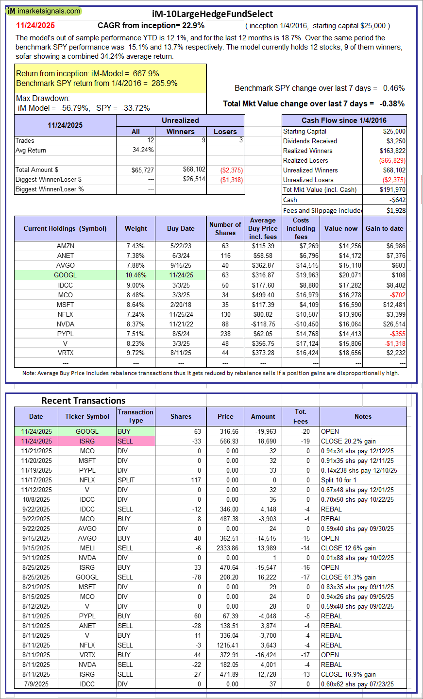 iM-10LargeHedgeFundSelect: Since inception, on 1/5/2016, the model gained 667.88% while the benchmark SPY gained 285.89% over the same period. Over the previous week the market value of iM-10LargeHedgeFundSelect gained -0.38% at a time when SPY gained 0.46%. A starting capital of $25,000 at inception on 1/5/2016 would have grown to $191,970 which includes -$642 cash and excludes $1,928 spent on fees and slippage. |