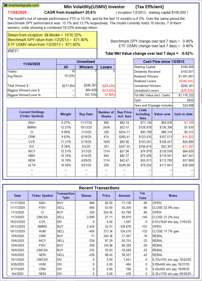 iM-Min Volatility(USMV) Investor (Tax Efficient): The model’s out of sample performance YTD is 15.5%, and for the last 12 months is 6.2%. Over the same period the benchmark SPY performance was 15.1% and 13.7% respectively. Since inception, on 1/3/2013, the model gained 1016.32% while the benchmark SPY gained 471.80% and the ETF USMV gained 471.80% over the same period. Over the previous week the market value of iM-Best12(USMV)Q1 gained -0.52% at a time when SPY gained 0.46%. A starting capital of $100,000 at inception on 1/3/2013 would have grown to $1,116,322 which includes $423 cash and excludes $14,948 spent on fees and slippage. |