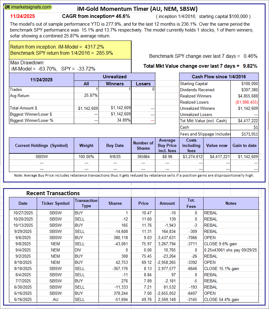 iM-Gold Momentum Timer (AU, NEM, SBSW): The model’s out of sample performance YTD is 277.9%, and for the last 12 months is 236.1%. Over the same period the benchmark SPY performance was 15.1% and 13.7% respectively. Over the previous week the market value of iM-Gold Momentum Timer (AU, NEM, SBSW) gained 9.82% at a time when SPY gained 0.46%. A starting capital of $100,000 at inception on 6/30/2016 would have grown to $01 which includes $171,911 cash and excludes Gain to date spent on fees and slippage. |