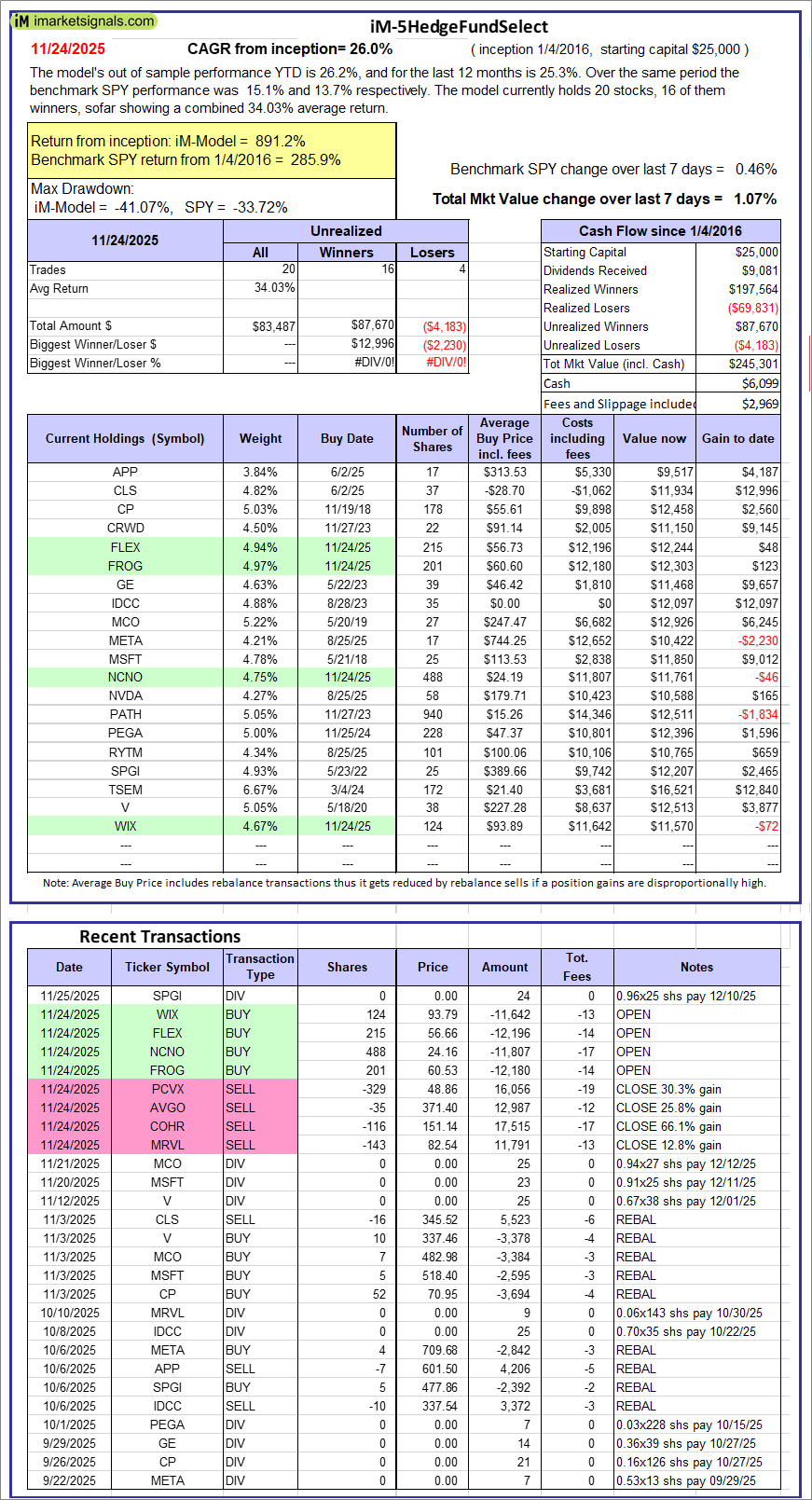 iM-5HedgeFundSelect: Since inception, on 1/5/2016, the model gained 891.19% while the benchmark SPY gained 285.89% over the same period. Over the previous week the market value of iM-5HedgeFundSelect gained 1.07% at a time when SPY gained 0.46%. A starting capital of $25,000 at inception on 1/5/2016 would have grown to $245,301 which includes $6,099 cash and excludes $2,969 spent on fees and slippage. |