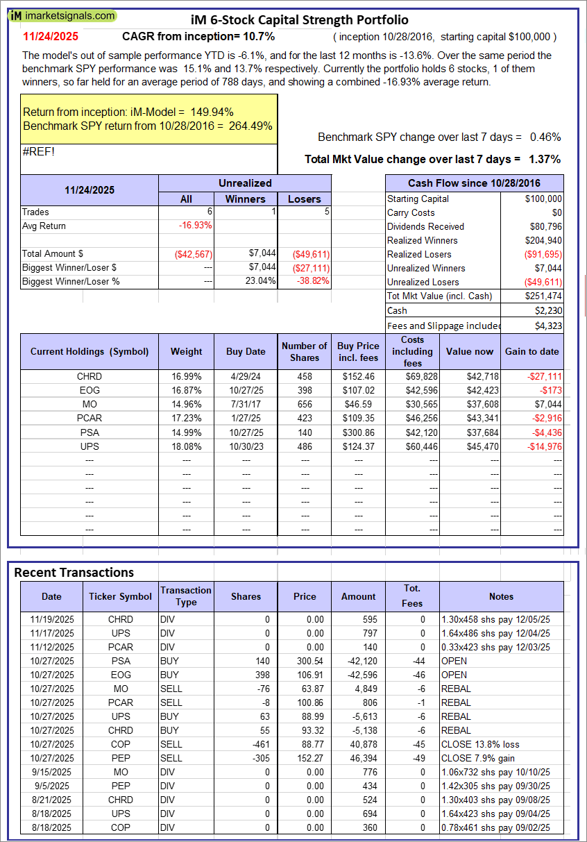 iM 6-Stock Capital Strength Portfolio: The model’s out of sample performance YTD is -6.1%, and for the last 12 months is -13.6%. Over the same period the benchmark SPY performance was 15.1% and 13.7% respectively. Over the previous week the market value of the iM 6-Stock Capital Strength Portfolio gained 1.37% at a time when SPY gained 0.46%. A starting capital of $100,000 at inception on 10/28/2016 would have grown to $251,474 which includes $2,230 cash and excludes $4,323 spent on fees and slippage. |