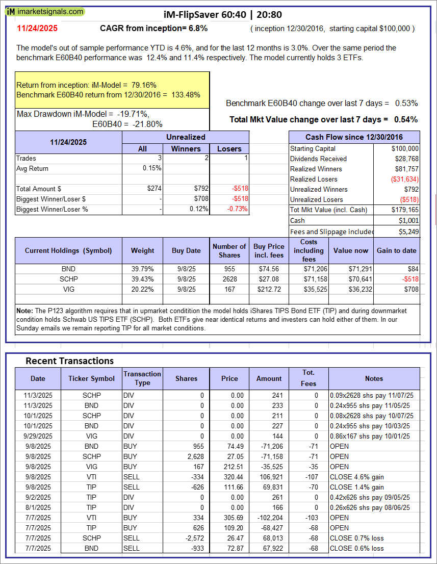 iM-FlipSaver 60:40 | 20:80 – 2017: The model’s out of sample performance YTD is 4.6%, and for the last 12 months is 3.0%. Over the same period the benchmark E60B40 performance was 12.4% and 11.4% respectively. Over the previous week the market value of iM-FlipSaver 80:20 | 20:80 gained 0.54% at a time when SPY gained 0.53%. A starting capital of $100,000 at inception on 7/16/2015 would have grown to $179,165 which includes $1,001 cash and excludes $5,249 spent on fees and slippage. |