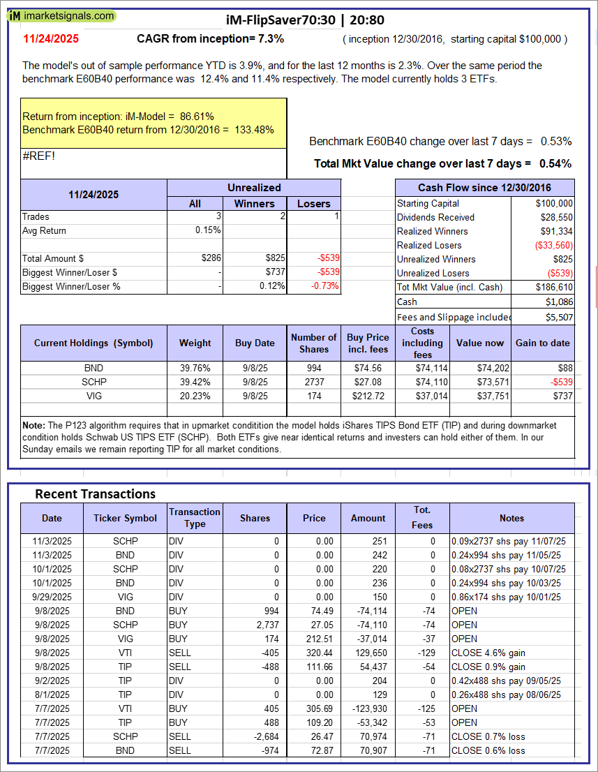 iM-FlipSaver 70:30 | 20:80 – 2017: The model’s out of sample performance YTD is 3.9%, and for the last 12 months is 2.3%. Over the same period the benchmark E60B40 performance was 12.4% and 11.4% respectively. Over the previous week the market value of iM-FlipSaver 70:30 | 20:80 gained 0.54% at a time when SPY gained 0.53%. A starting capital of $100,000 at inception on 7/15/2015 would have grown to $186,610 which includes $1,086 cash and excludes $5,507 spent on fees and slippage. |
