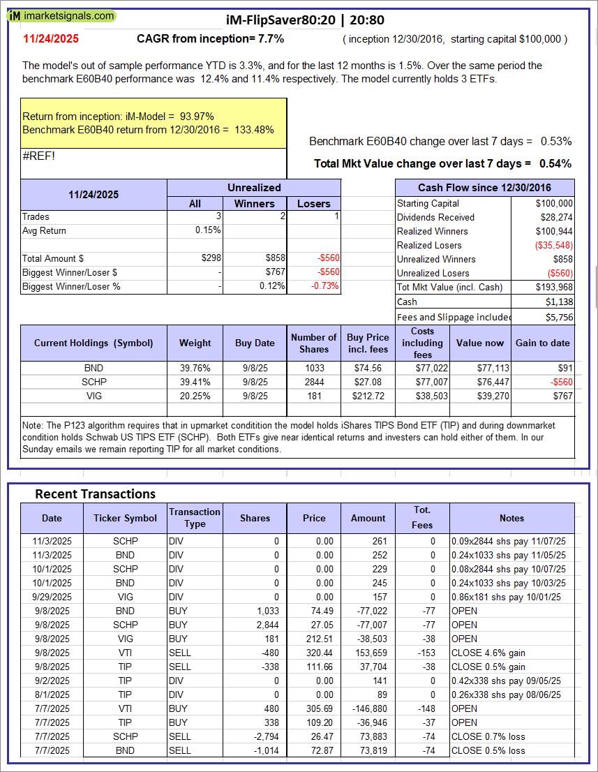 iM-FlipSaver 80:20 | 20:80 – 2017: The model’s out of sample performance YTD is 3.3%, and for the last 12 months is 1.5%. Over the same period the benchmark E60B40 performance was 12.4% and 11.4% respectively. Over the previous week the market value of iM-FlipSaver 80:20 | 20:80 gained 0.54% at a time when SPY gained 0.53%. A starting capital of $100,000 at inception on 1/2/2017 would have grown to $193,968 which includes $1,138 cash and excludes $5,756 spent on fees and slippage. |