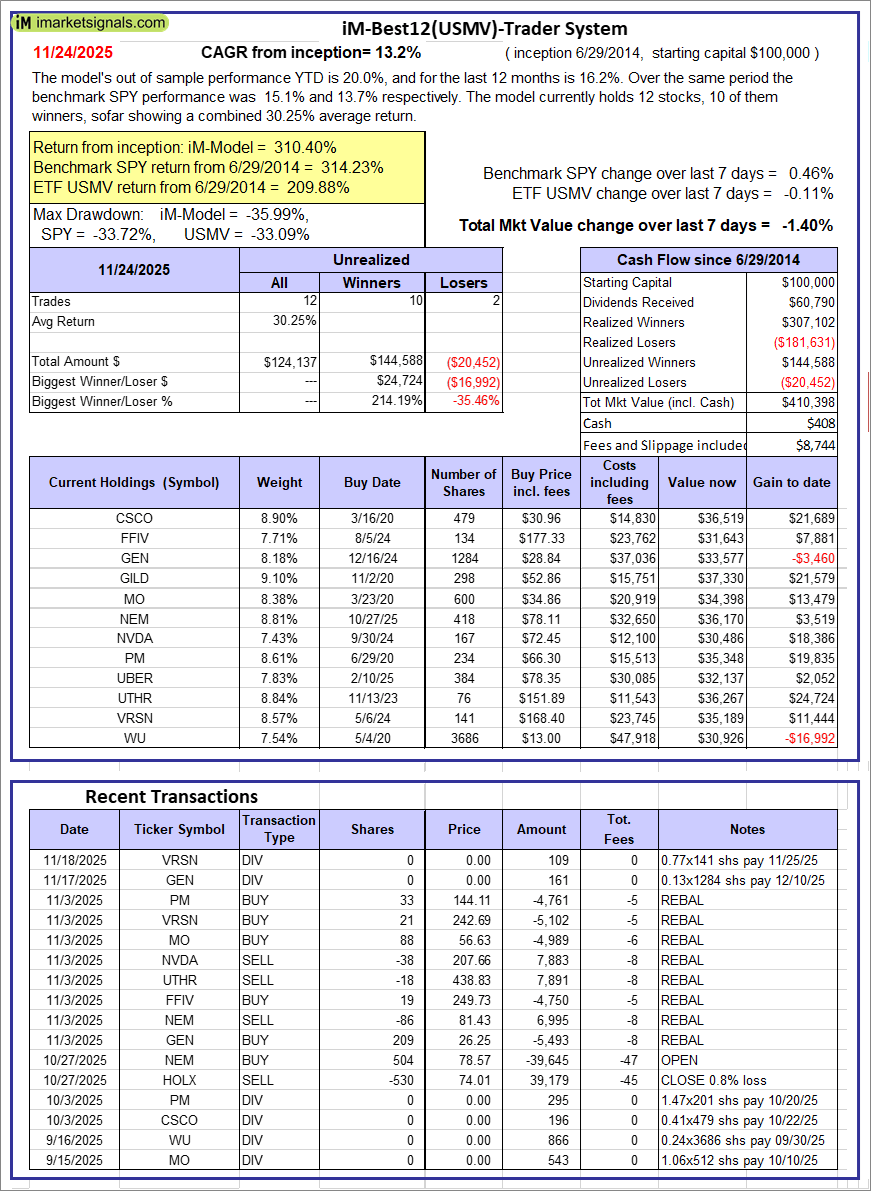 iM-Best12(USMV)-Trader: The model’s out of sample performance YTD is 20.0%, and for the last 12 months is 16.2%. Over the same period the benchmark SPY performance was 15.1% and 13.7% respectively. Since inception, on 6/30/2014, the model gained 310.40% while the benchmark SPY gained 314.23% and the ETF USMV gained 209.88% over the same period. Over the previous week the market value of iM-Best12(USMV)-Trader gained -1.40% at a time when SPY gained 0.46%. A starting capital of $100,000 at inception on 6/30/2014 would have grown to $410,398 which includes $408 cash and excludes $8,744 spent on fees and slippage. |