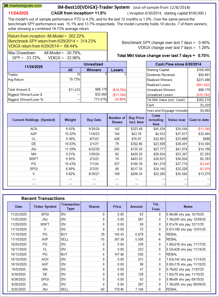 iM-Best10(VDIGX)-Trader: The model’s out of sample performance YTD is 4.2%, and for the last 12 months is 1.0%. Over the same period the benchmark SPY performance was 15.1% and 13.7% respectively. Since inception, on 7/1/2014, the model gained 262.22% while the benchmark SPY gained 314.23% and VDIGX gained 68.44% over the same period. Over the previous week the market value of iM-Best10(VDIGX) gained 0.70% at a time when SPY gained 0.46%. A starting capital of $100,000 at inception on 7/1/2014 would have grown to $362,219 which includes $1,319 cash and excludes $5,493 spent on fees and slippage. |