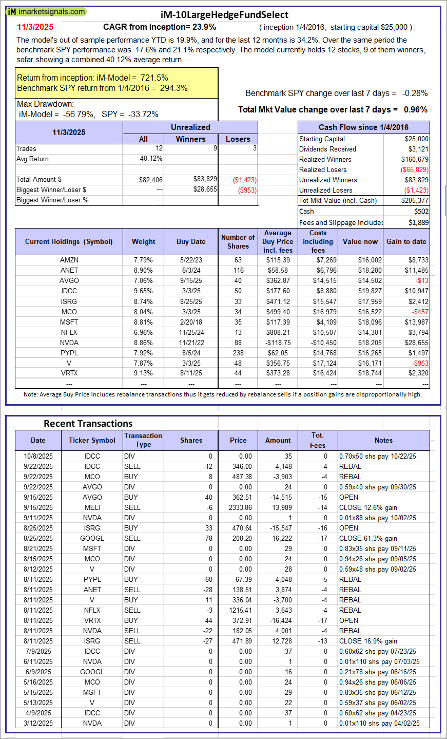iM-10LargeHedgeFundSelect: Since inception, on 1/5/2016, the model gained 721.51% while the benchmark SPY gained 294.32% over the same period. Over the previous week the market value of iM-10LargeHedgeFundSelect gained 0.96% at a time when SPY gained -0.28%. A starting capital of $25,000 at inception on 1/5/2016 would have grown to $205,377 which includes $502 cash and excludes $1,889 spent on fees and slippage. |