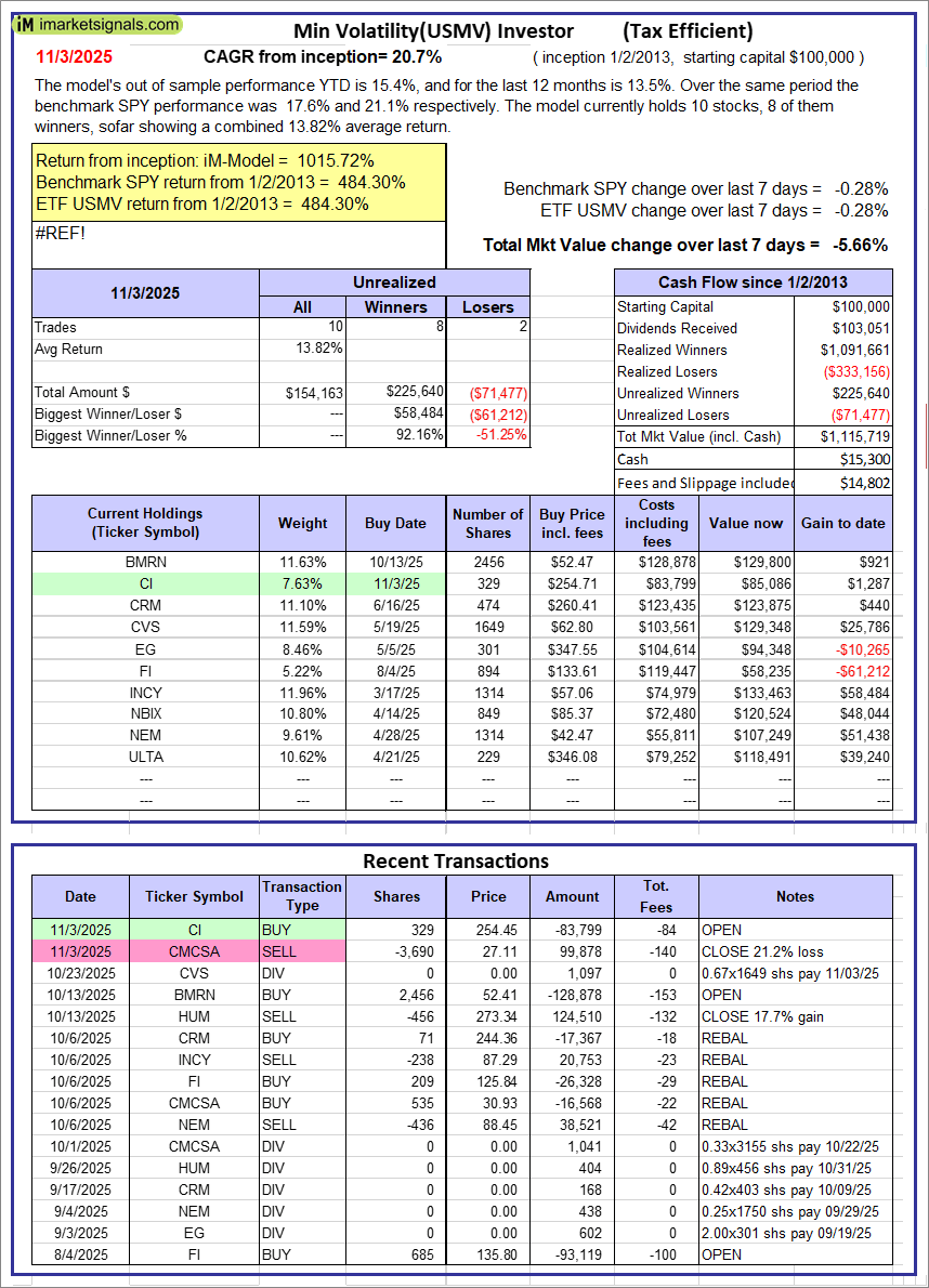 iM-Min Volatility(USMV) Investor (Tax Efficient): The model’s out of sample performance YTD is 15.4%, and for the last 12 months is 13.5%. Over the same period the benchmark SPY performance was 17.6% and 21.1% respectively. Since inception, on 1/3/2013, the model gained 1015.72% while the benchmark SPY gained 484.30% and the ETF USMV gained 484.30% over the same period. Over the previous week the market value of iM-Best12(USMV)Q1 gained -5.66% at a time when SPY gained -0.28%. A starting capital of $100,000 at inception on 1/3/2013 would have grown to $1,115,719 which includes $15,300 cash and excludes $14,802 spent on fees and slippage. |