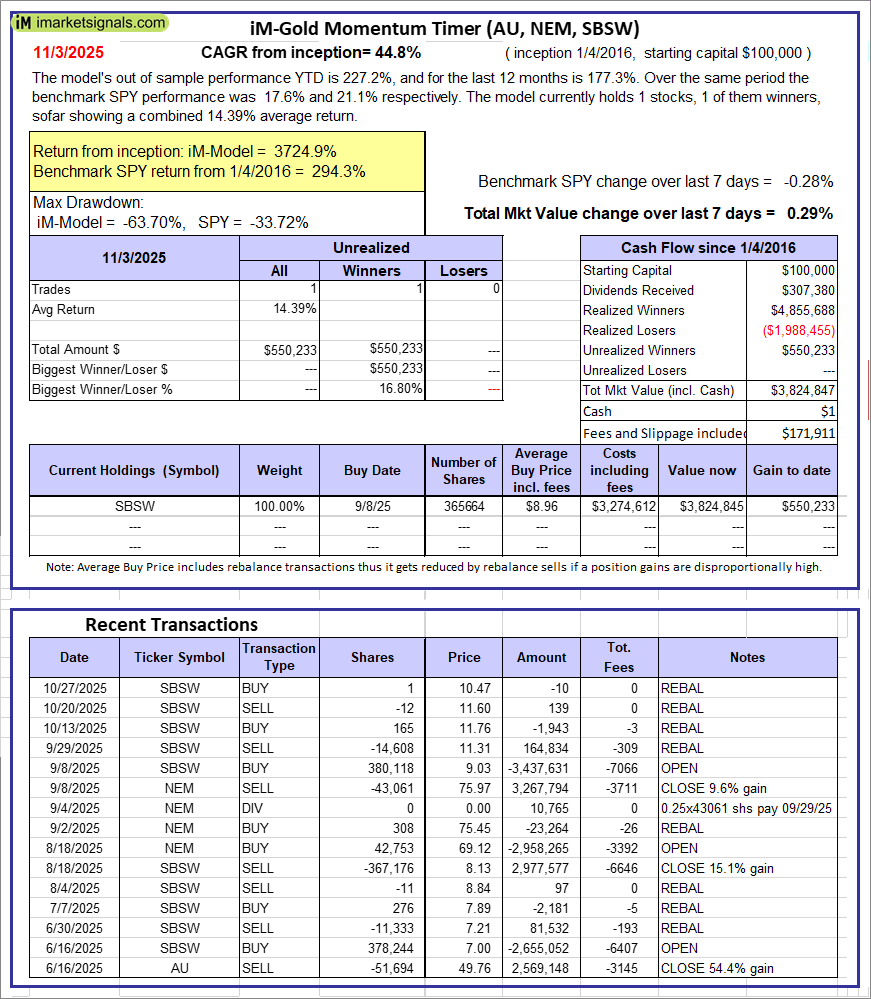 iM-Gold Momentum Timer (AU, NEM, SBSW): The model’s out of sample performance YTD is 227.2%, and for the last 12 months is 177.3%. Over the same period the benchmark SPY performance was 17.6% and 21.1% respectively. Over the previous week the market value of iM-Gold Momentum Timer (AU, NEM, SBSW) gained 0.29% at a time when SPY gained -0.28%. A starting capital of $100,000 at inception on 6/30/2016 would have grown to $01 which includes $171,911 cash and excludes Gain to date spent on fees and slippage. |