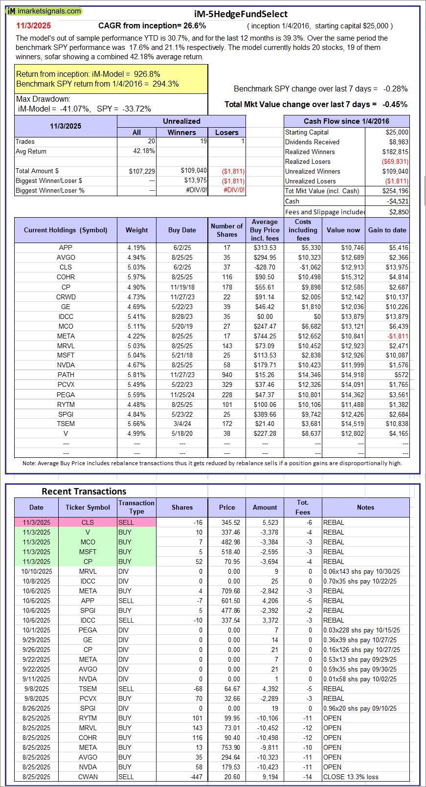 iM-5HedgeFundSelect: Since inception, on 1/5/2016, the model gained 926.77% while the benchmark SPY gained 294.32% over the same period. Over the previous week the market value of iM-5HedgeFundSelect gained -0.45% at a time when SPY gained -0.28%. A starting capital of $25,000 at inception on 1/5/2016 would have grown to $254,196 which includes -$4,521 cash and excludes $2,850 spent on fees and slippage. |