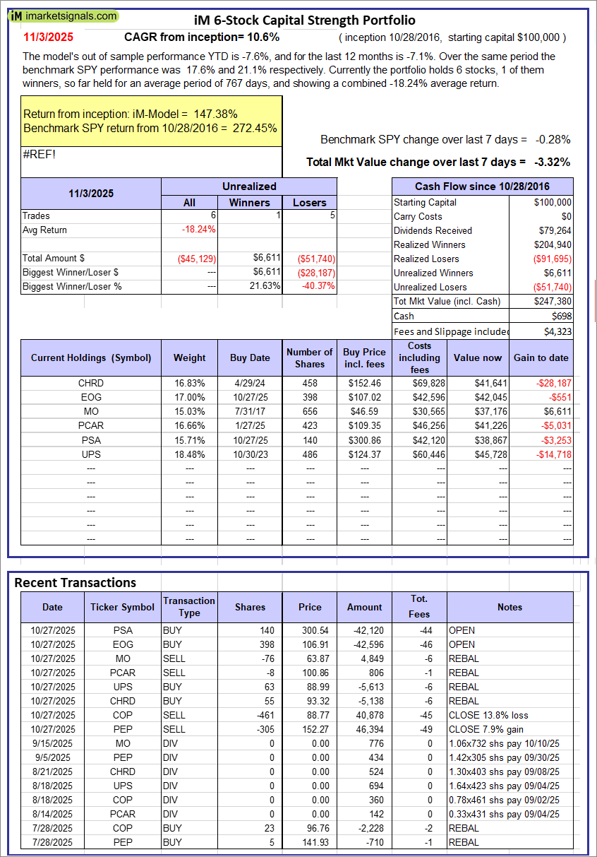 iM 6-Stock Capital Strength Portfolio: The model’s out of sample performance YTD is -7.6%, and for the last 12 months is -7.1%. Over the same period the benchmark SPY performance was 17.6% and 21.1% respectively. Over the previous week the market value of the iM 6-Stock Capital Strength Portfolio gained -3.32% at a time when SPY gained -0.28%. A starting capital of $100,000 at inception on 10/28/2016 would have grown to $247,380 which includes $698 cash and excludes $4,323 spent on fees and slippage. |