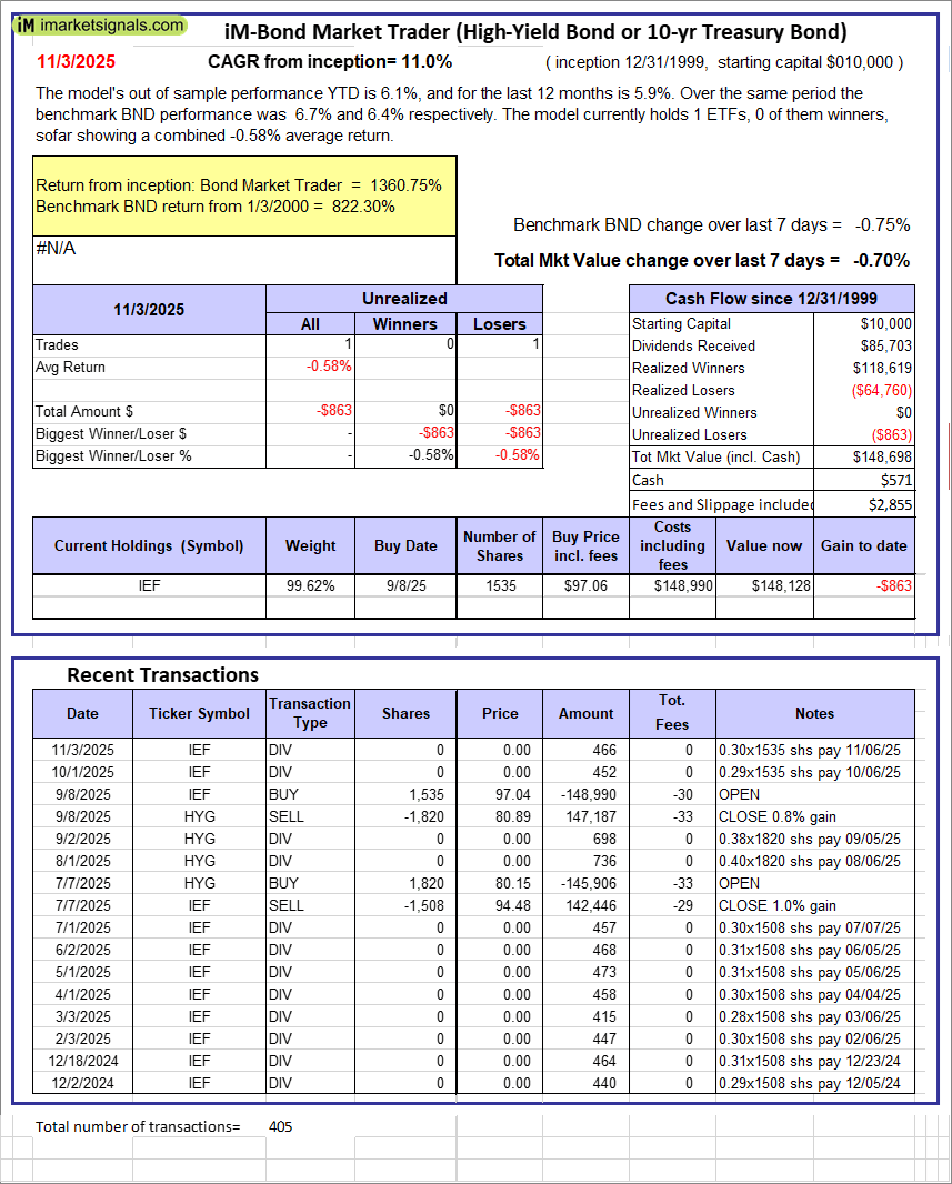 iM-Bond Market Trader (High-Yield Bond or 10-yr Treasury Bond): The model’s out of sample performance YTD is 6.1%, and for the last 12 months is 5.9%. Over the same period the benchmark BND performance was 6.7% and 6.4% respectively. Over the previous week the market value of the iM-Bond Market Trader (High-Yield Bond or 10-yr Treasury Bond) gained -0.70% at a time when BND gained -0.75%. A starting capital of $10,000 at inception on 1/3/2000 would have grown to $148,698 which includes $571 cash and excludes $2,855 spent on fees and slippage. |