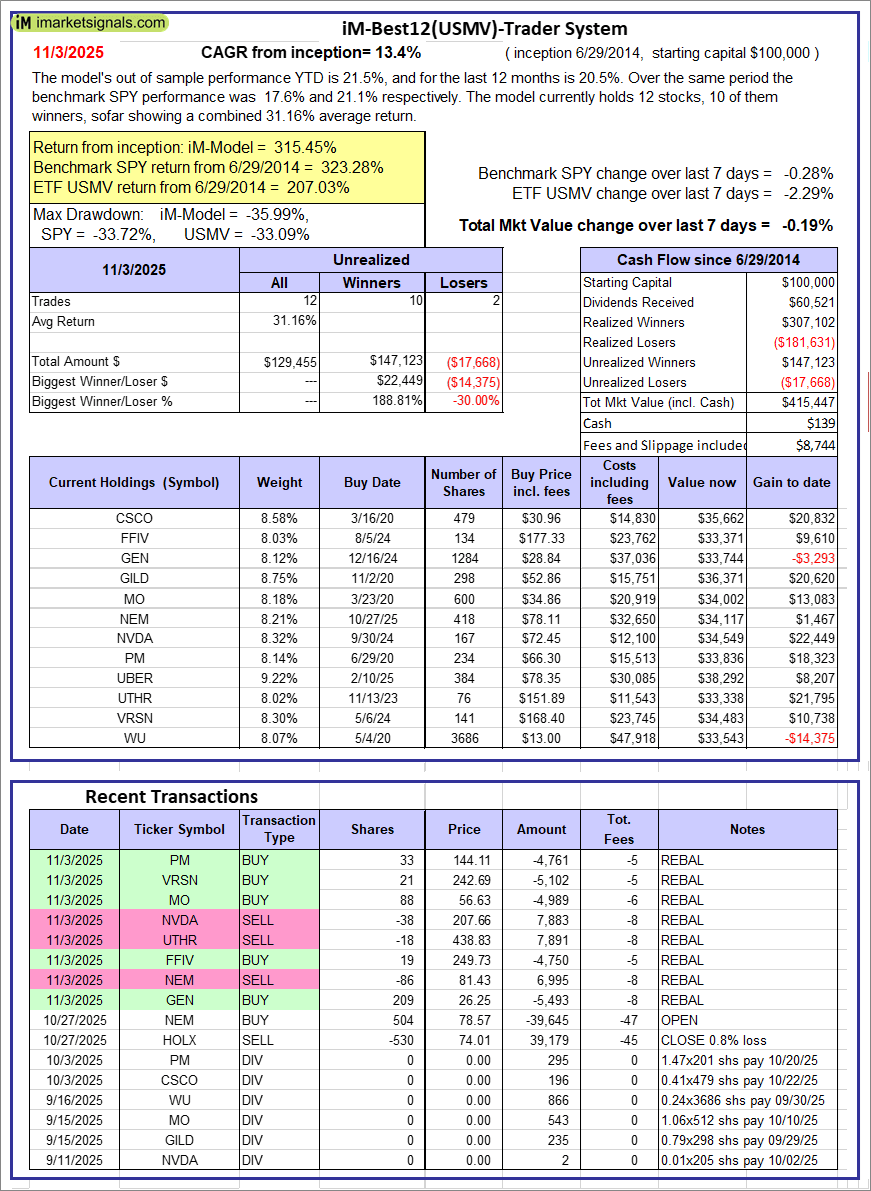 iM-Best12(USMV)-Trader: The model’s out of sample performance YTD is 21.5%, and for the last 12 months is 20.5%. Over the same period the benchmark SPY performance was 17.6% and 21.1% respectively. Since inception, on 6/30/2014, the model gained 315.45% while the benchmark SPY gained 323.28% and the ETF USMV gained 207.03% over the same period. Over the previous week the market value of iM-Best12(USMV)-Trader gained -0.19% at a time when SPY gained -0.28%. A starting capital of $100,000 at inception on 6/30/2014 would have grown to $415,447 which includes $139 cash and excludes $8,744 spent on fees and slippage. |