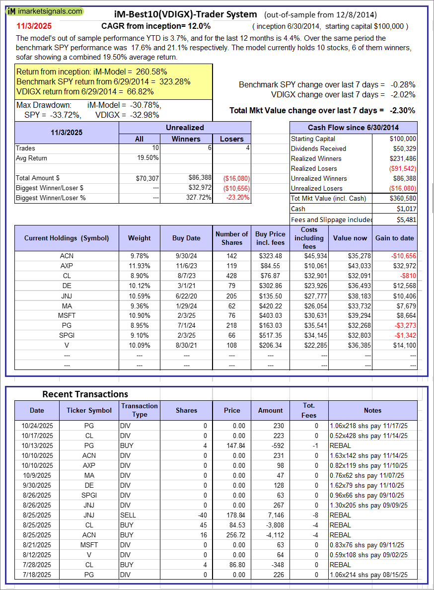 iM-Best10(VDIGX)-Trader: The model’s out of sample performance YTD is 3.7%, and for the last 12 months is 4.4%. Over the same period the benchmark SPY performance was 17.6% and 21.1% respectively. Since inception, on 7/1/2014, the model gained 260.58% while the benchmark SPY gained 323.28% and VDIGX gained 66.82% over the same period. Over the previous week the market value of iM-Best10(VDIGX) gained -2.30% at a time when SPY gained -0.28%. A starting capital of $100,000 at inception on 7/1/2014 would have grown to $360,580 which includes $1,017 cash and excludes $5,481 spent on fees and slippage. |