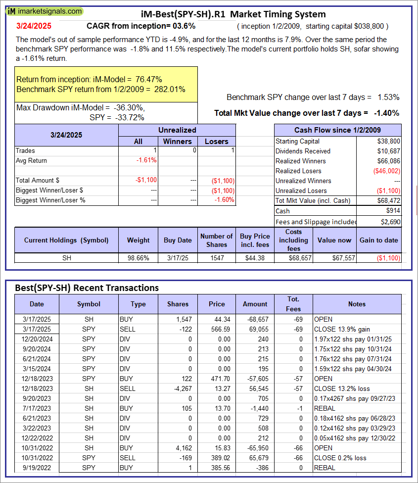 iM-Best(SPY-SH).R1: The model’s out of sample performance YTD is -4.9%, and for the last 12 months is 7.9%. Over the same period the benchmark SPY performance was -1.8% and 11.5% respectively. Over the previous week the market value of Best(SPY-SH) gained -1.40% at a time when SPY gained 1.53%. A starting capital of $100,000 at inception on 1/2/2009 would have grown to $68,472 which includes $914 cash and excludes $2,690 spent on fees and slippage. |
