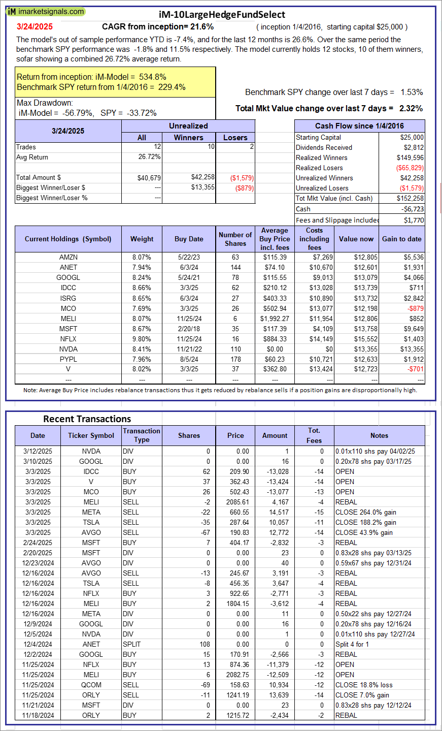 iM-10LargeHedgeFundSelect: Since inception, on 1/5/2016, the model gained 534.83% while the benchmark SPY gained 229.38% over the same period. Over the previous week the market value of iM-10LargeHedgeFundSelect gained 2.32% at a time when SPY gained 1.53%. A starting capital of $25,000 at inception on 1/5/2016 would have grown to $152,258 which includes -$6,723 cash and excludes $1,770 spent on fees and slippage. |