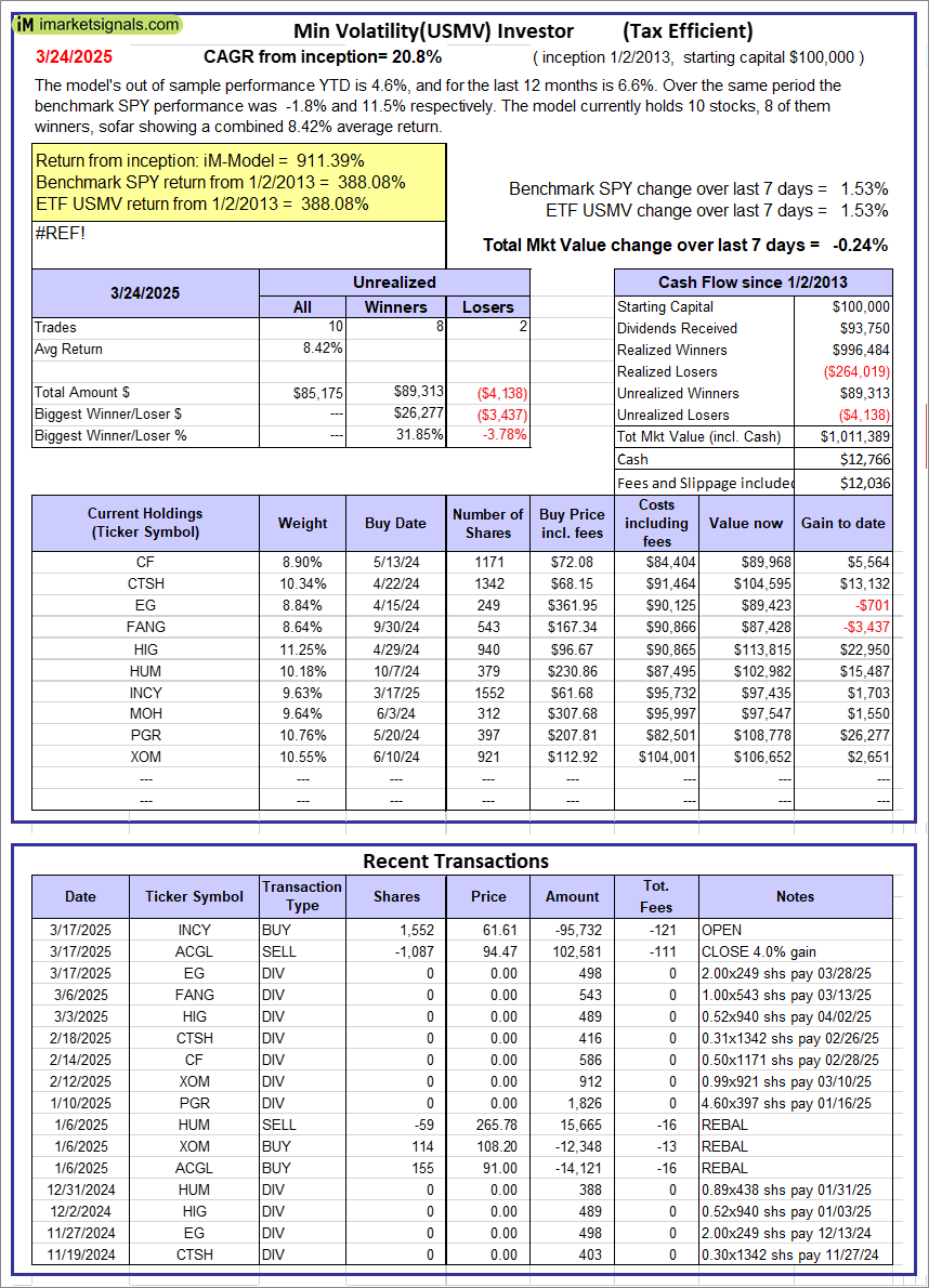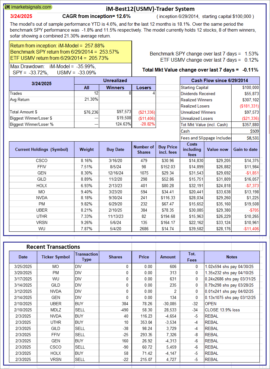 iM-Min Volatility(USMV) Investor (Tax Efficient): The model’s out of sample performance YTD is 4.6%, and for the last 12 months is 6.6%. Over the same period the benchmark SPY performance was -1.8% and 11.5% respectively. Since inception, on 1/3/2013, the model gained 911.39% while the benchmark SPY gained 388.08% and the ETF USMV gained 388.08% over the same period. Over the previous week the market value of iM-Best12(USMV)Q1 gained -0.24% at a time when SPY gained 1.53%. A starting capital of $100,000 at inception on 1/3/2013 would have grown to $1,011,389 which includes $12,766 cash and excludes $12,036 spent on fees and slippage. |