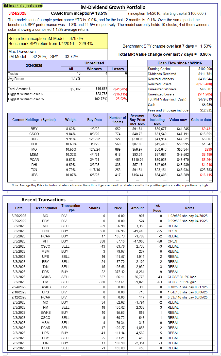 iM-Dividend Growth Portfolio: The model’s out of sample performance YTD is -0.9%, and for the last 12 months is -0.1%. Over the same period the benchmark SPY performance was -1.8% and 11.5% respectively. Over the previous week the market value of the iM-Dividend Growth Portfolio gained 0.90% at a time when SPY gained 1.53%. A starting capital of $100,000 at inception on 6/30/2016 would have grown to $479,619 which includes $5,939 cash and excludes $12,931 spent on fees and slippage. |