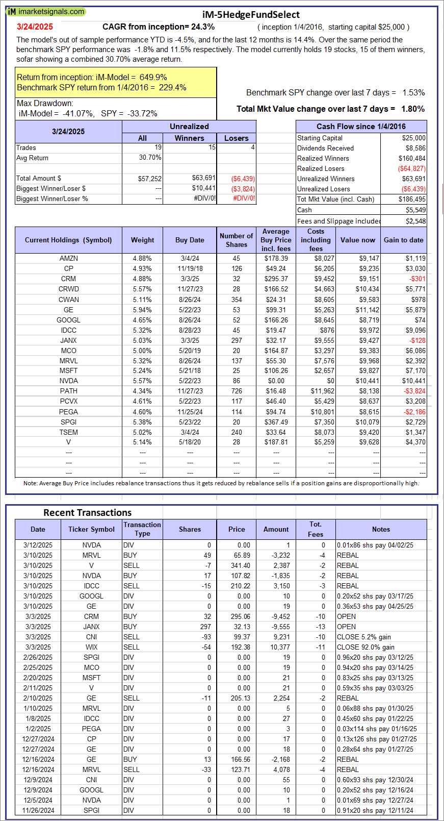 iM-5HedgeFundSelect: Since inception, on 1/5/2016, the model gained 649.94% while the benchmark SPY gained 229.38% over the same period. Over the previous week the market value of iM-5HedgeFundSelect gained 1.80% at a time when SPY gained 1.53%. A starting capital of $25,000 at inception on 1/5/2016 would have grown to $186,495 which includes $5,549 cash and excludes $2,548 spent on fees and slippage. |