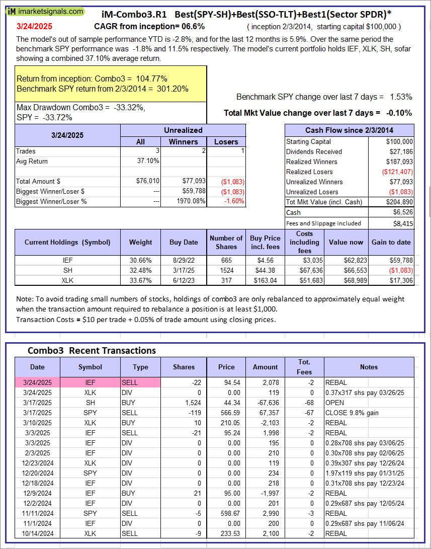 iM-Combo3.R1: The model’s out of sample performance YTD is -2.8%, and for the last 12 months is 5.9%. Over the same period the benchmark SPY performance was -1.8% and 11.5% respectively. Over the previous week the market value of iM-Combo3.R1 gained -0.10% at a time when SPY gained 1.53%. A starting capital of $100,000 at inception on 2/3/2014 would have grown to $204,890 which includes $6,526 cash and excludes $8,415 spent on fees and slippage. |