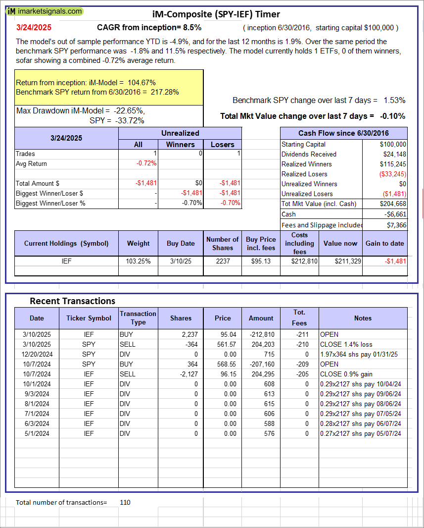 iM-Composite (SPY-IEF) Timer: The model’s out of sample performance YTD is -4.9%, and for the last 12 months is 1.9%. Over the same period the benchmark SPY performance was -1.8% and 11.5% respectively. Over the previous week the market value of the iM-Composite (SPY-IEF) Timer gained -0.10% at a time when SPY gained 1.53%. A starting capital of $100,000 at inception on 6/30/2016 would have grown to $204,668 which includes -$6,661 cash and excludes $7,366 spent on fees and slippage. |