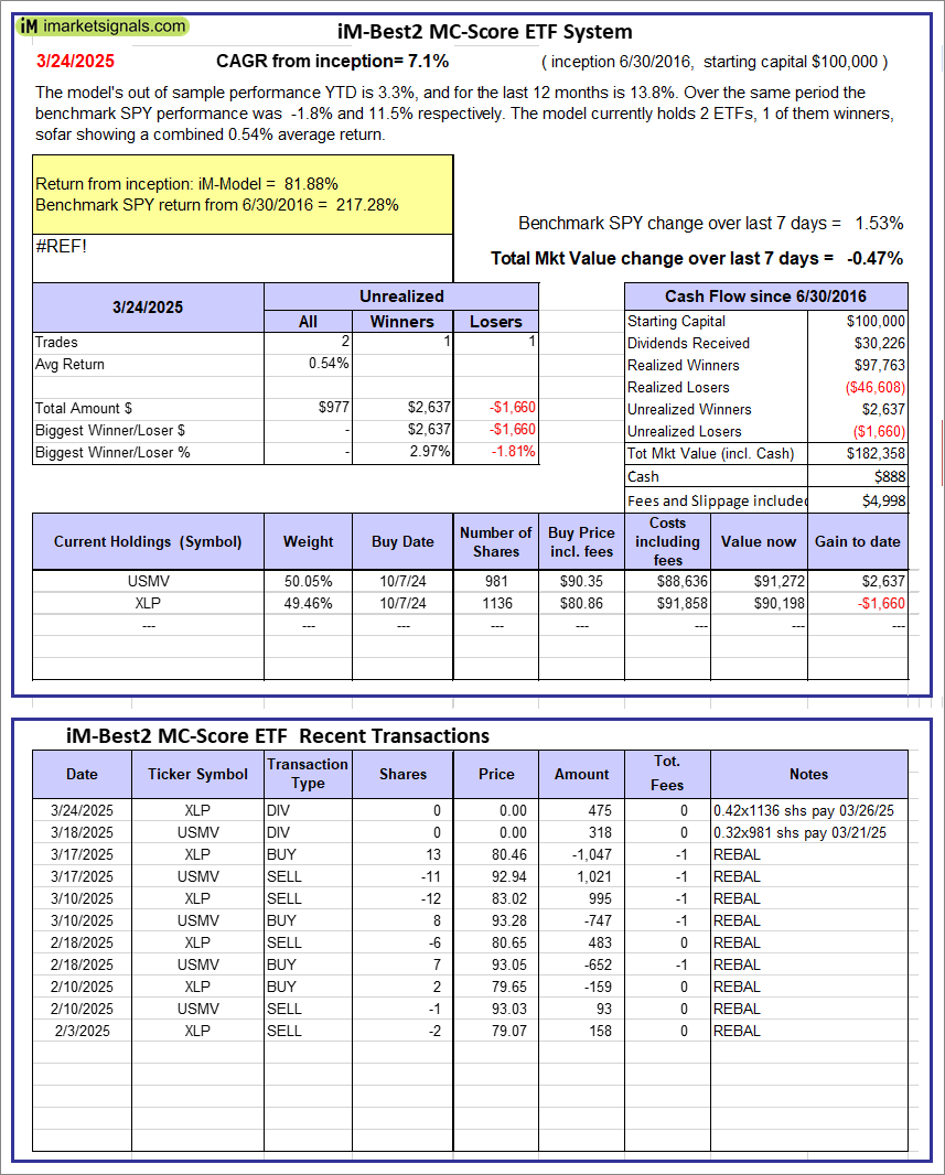 iM-Best2 MC-Score ETF System: The model’s out of sample performance YTD is 3.3%, and for the last 12 months is 13.8%. Over the same period the benchmark SPY performance was -1.8% and 11.5% respectively. Over the previous week the market value of the iM-Best2 MC-Score ETF System gained -0.47% at a time when SPY gained 1.53%. A starting capital of $100,000 at inception on 6/30/2016 would have grown to $182,358 which includes $888 cash and excludes $4,998 spent on fees and slippage. |