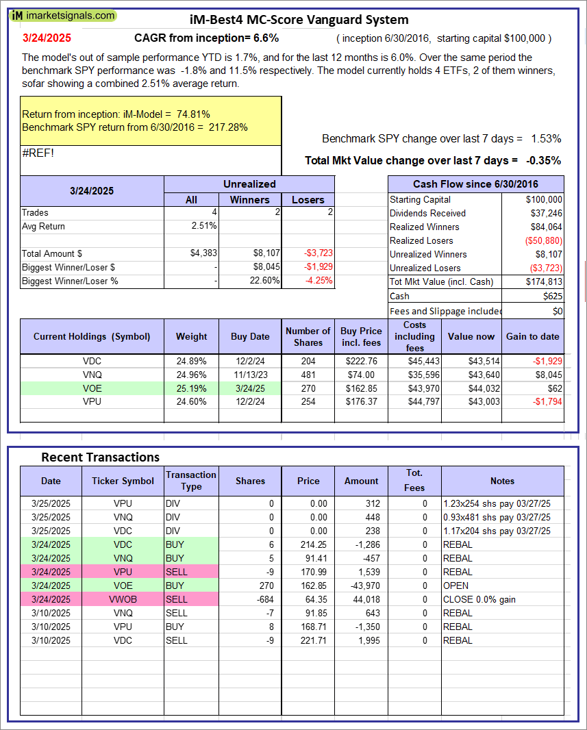 iM-Best4 MC-Score Vanguard System: The model’s out of sample performance YTD is 1.7%, and for the last 12 months is 6.0%. Over the same period the benchmark SPY performance was -1.8% and 11.5% respectively. Over the previous week the market value of the iM-Best4 MC-Score Vanguard System gained -0.35% at a time when SPY gained 1.53%. A starting capital of $100,000 at inception on 6/30/2016 would have grown to $174,813 which includes $625 cash and excludes $00 spent on fees and slippage. |