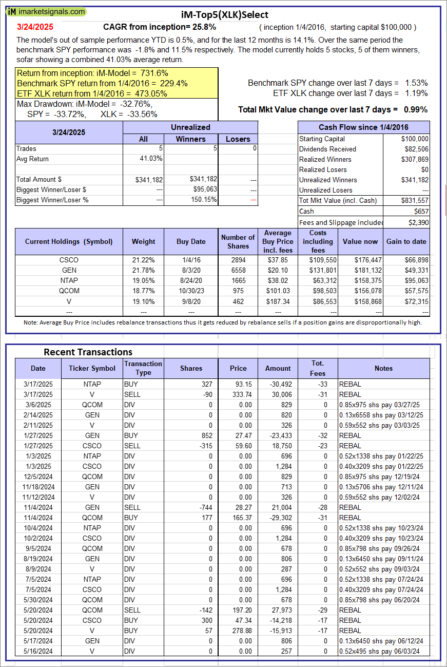 iM-Top5(XLK)Select: Since inception, on 1/5/2016, the model gained 731.56% while the benchmark SPY gained 229.38% over the same period. Over the previous week the market value of iM-Top5(XLK)Select gained 0.99% at a time when SPY gained 1.53%. A starting capital of $100,000 at inception on 1/5/2016 would have grown to $831,557 which includes $657 cash and excludes $2,390 spent on fees and slippage. |