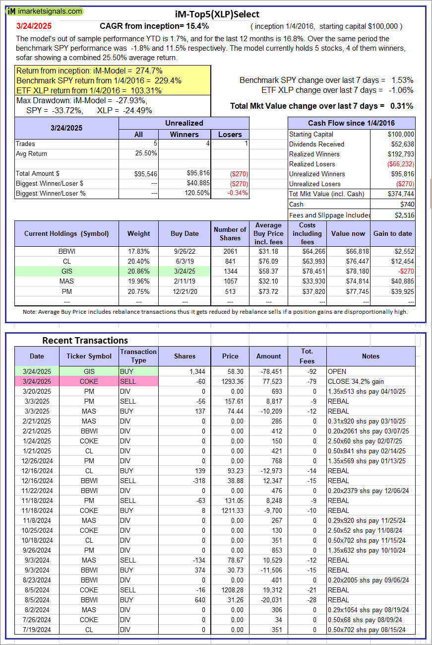 iM-Top5(XLP)Select: Since inception, on 1/5/2016, the model gained 274.74% while the benchmark SPY gained 229.38% over the same period. Over the previous week the market value of iM-Top5(XLP)Select gained 0.31% at a time when SPY gained 1.53%. A starting capital of $100,000 at inception on 1/5/2016 would have grown to $374,744 which includes $740 cash and excludes $2,516 spent on fees and slippage. |