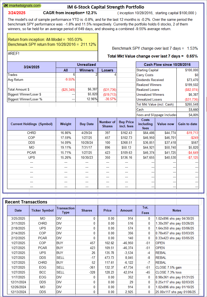 iM 6-Stock Capital Strength Portfolio: The model’s out of sample performance YTD is -0.8%, and for the last 12 months is -0.2%. Over the same period the benchmark SPY performance was -1.8% and 11.5% respectively. Over the previous week the market value of the iM 6-Stock Capital Strength Portfolio gained 0.65% at a time when SPY gained 1.53%. A starting capital of $100,000 at inception on 10/28/2016 would have grown to $265,548 which includes $3,660 cash and excludes $4,005 spent on fees and slippage. |
