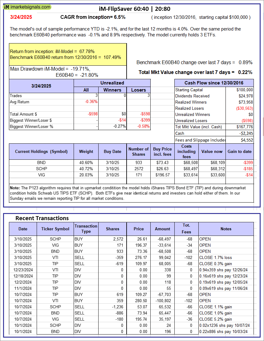 iM-Inflation Attuned Multi-Model Market Timer: The model’s out of sample performance YTD is 4.9%, and for the last 12 months is -4.4%. Over the same period the benchmark SPY performance was -1.8% and 11.5% respectively. Over the previous week the market value of the iM-Inflation Attuned Multi-Model Market Timer gained -1.37% at a time when SPY gained 1.53%. A starting capital of $100,000 at inception on 3/24/2017 would have grown to $129,700,687 which includes $1,921,515 cash and excludes $3,678,771 spent on fees and slippage. |
