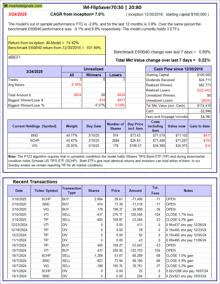 iM-FlipSaver 70:30 | 20:80 – 2017: The model’s out of sample performance YTD is -2.8%, and for the last 12 months is 3.8%. Over the same period the benchmark E60B40 performance was -0.1% and 8.9% respectively. Over the previous week the market value of iM-FlipSaver 70:30 | 20:80 gained 0.22% at a time when SPY gained 0.89%. A starting capital of $100,000 at inception on 7/15/2015 would have grown to $174,418 which includes -$2,946 cash and excludes $4,781 spent on fees and slippage. |