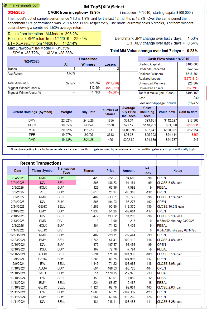iM-Top5(XLV)Select: Since inception, on 1/5/2016, the model gained 395.17% while the benchmark SPY gained 229.38% over the same period. Over the previous week the market value of iM-Top5(XLV)Select gained 0.23% at a time when SPY gained 1.53%. A starting capital of $100,000 at inception on 1/5/2016 would have grown to $495,169 which includes $30 cash and excludes $16,472 spent on fees and slippage. |