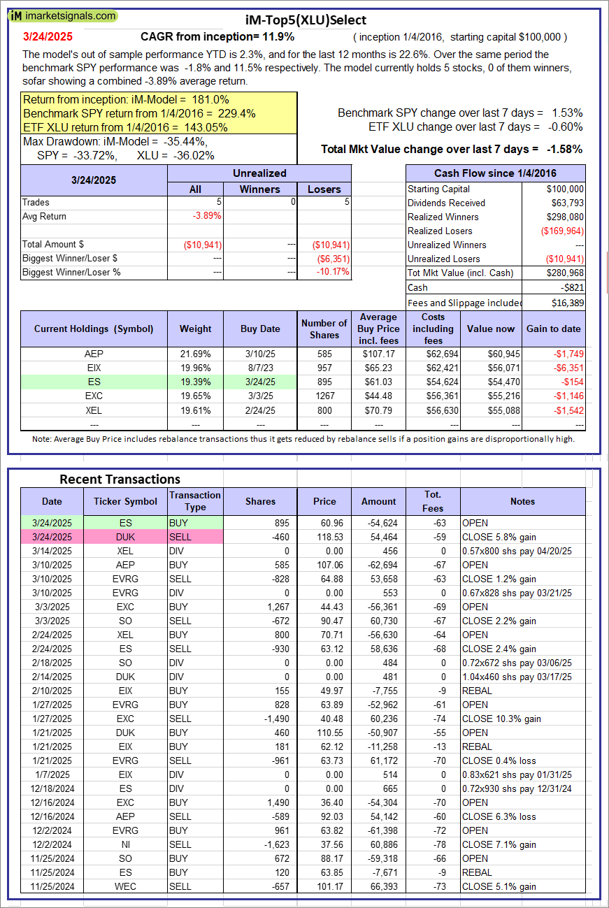 iM-Top5(XLU)Select: Since inception, on 1/5/2016, the model gained 180.97% while the benchmark SPY gained 229.38% over the same period. Over the previous week the market value of iM-Top5(XLU)Select gained -1.58% at a time when SPY gained 1.53%. A starting capital of $100,000 at inception on 1/5/2016 would have grown to $280,968 which includes -$821 cash and excludes $16,389 spent on fees and slippage. |