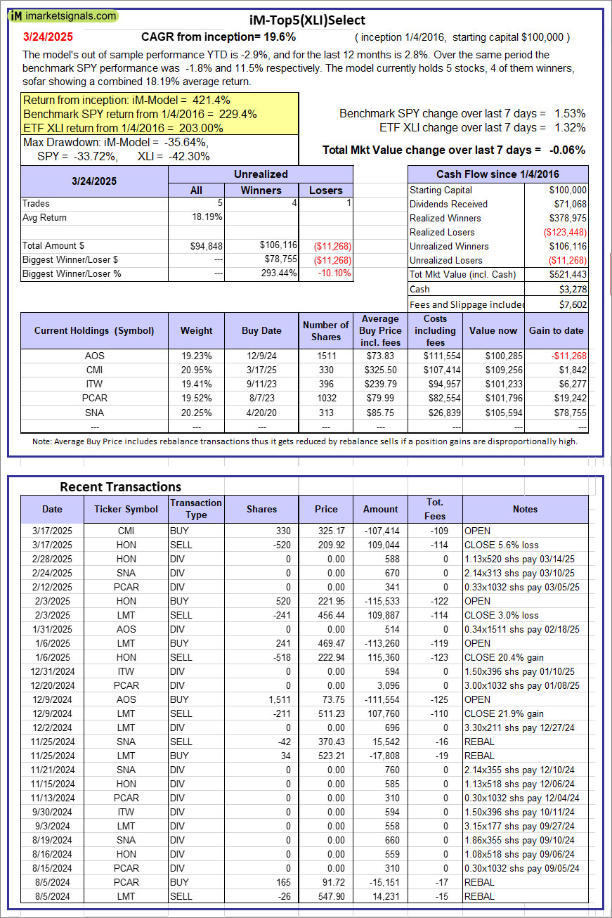 iM-Top5(XLI)Select: Since inception, on 1/5/2016, the model gained 421.44% while the benchmark SPY gained 229.38% over the same period. Over the previous week the market value of iM-Top5(XLI)Select gained -0.06% at a time when SPY gained 1.53%. A starting capital of $100,000 at inception on 1/5/2016 would have grown to $521,443 which includes $3,278 cash and excludes $7,602 spent on fees and slippage. |