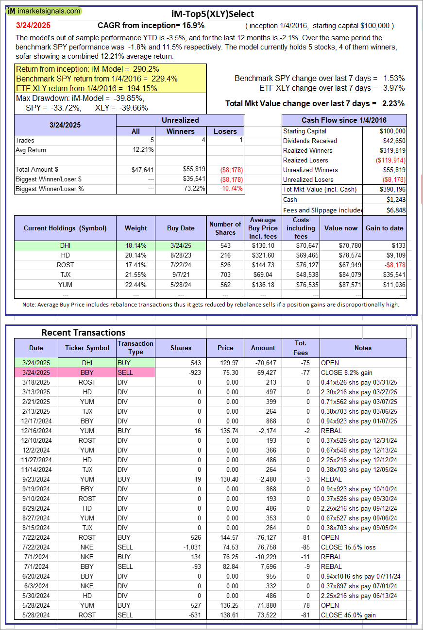 iM-Top5(XLY)Select: Since inception, on 1/5/2016, the model gained 290.20% while the benchmark SPY gained 229.38% over the same period. Over the previous week the market value of iM-Top5(XLY)Select gained 2.23% at a time when SPY gained 1.53%. A starting capital of $100,000 at inception on 1/5/2016 would have grown to $390,196 which includes $1,243 cash and excludes $6,848 spent on fees and slippage. |