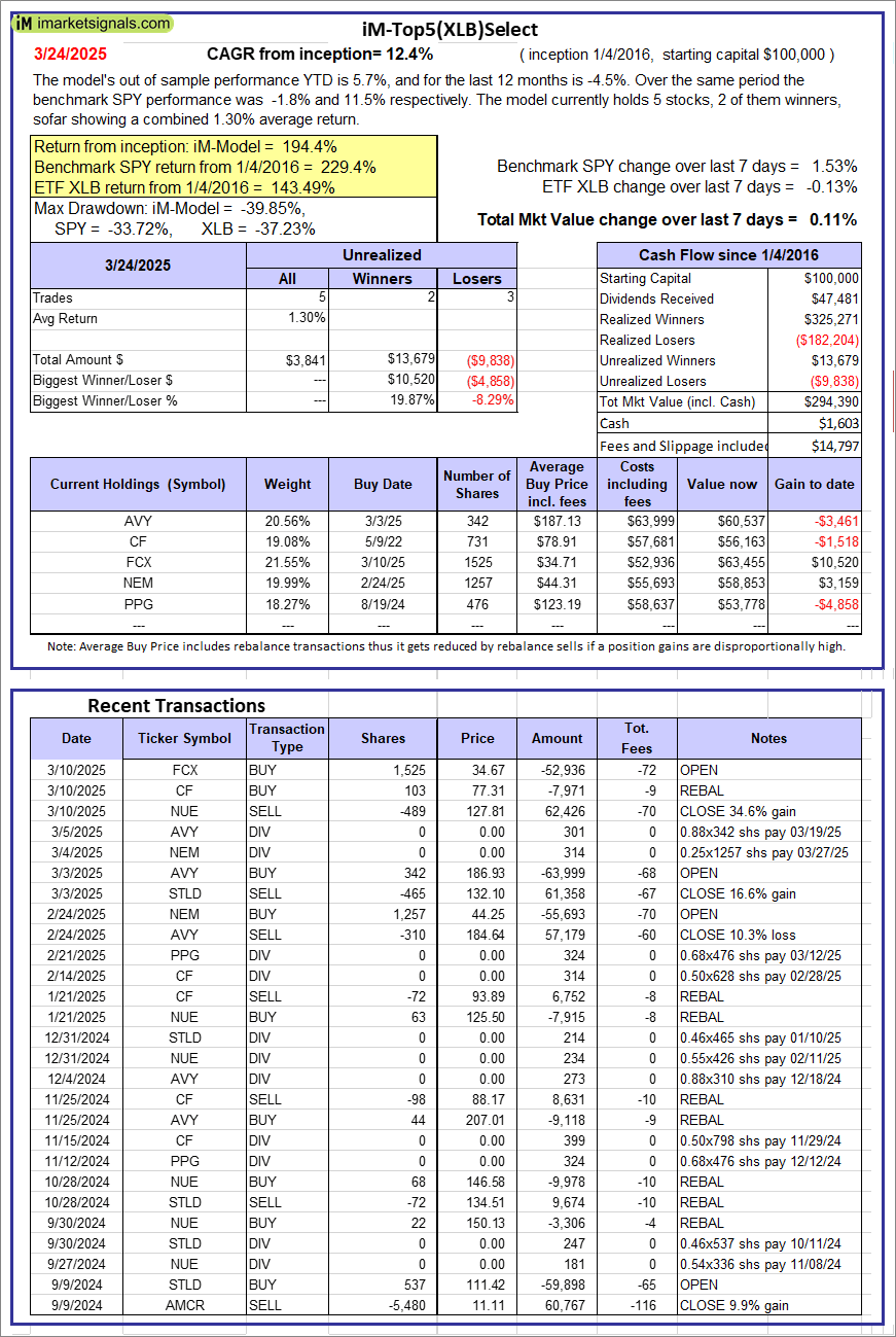 iM-Top5(XLB)Select: Since inception, on 1/5/2016, the model gained 194.39% while the benchmark SPY gained 229.38% over the same period. Over the previous week the market value of iM-Top5(XLB)Select gained 0.11% at a time when SPY gained 1.53%. A starting capital of $100,000 at inception on 1/5/2016 would have grown to $294,390 which includes $1,603 cash and excludes $14,797 spent on fees and slippage. |