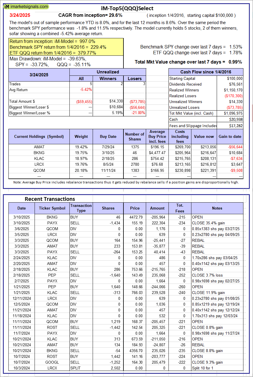 iM-Top5(QQQ)Select: Since inception, on 1/5/2016, the model gained 996.98% while the benchmark SPY gained 229.38% over the same period. Over the previous week the market value of iM-Top5(QQQ)Select gained 0.99% at a time when SPY gained 1.53%. A starting capital of $100,000 at inception on 1/5/2016 would have grown to $1,096,975 which includes $20,938 cash and excludes $17,282 spent on fees and slippage. |