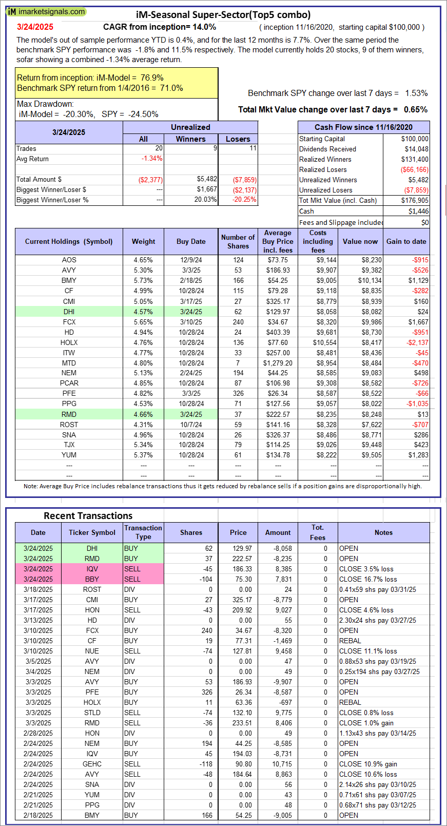 iM-Seasonal Super-Sectors (Top5 combo) : Since inception, on 11/17/2020, the model gained 76.90% while the benchmark SPY gained 70.98% over the same period. Over the previous week the market value of iM-Seasonal Super-Sectors (Top5 combo) gained 0.65% at a time when SPY gained 1.53%. A starting capital of $100,000 at inception on 11/17/2020 would have grown to $176,905 which includes $1,446 cash and excludes $00 spent on fees and slippage. |