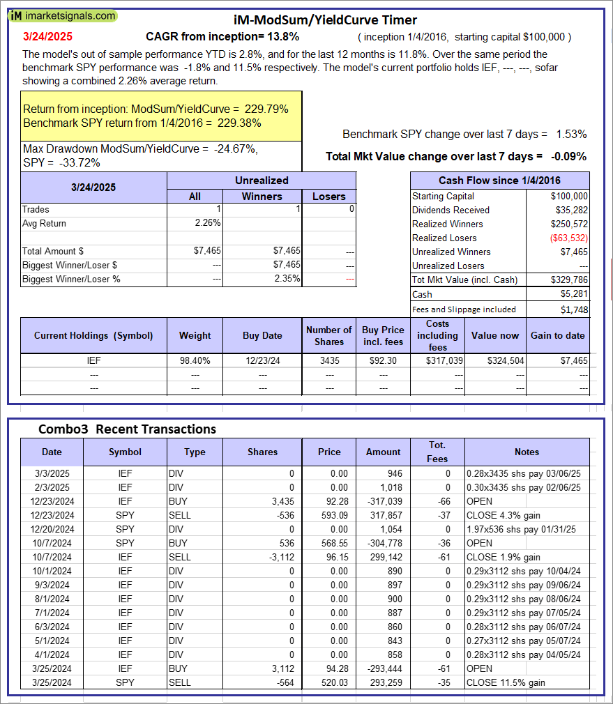 iM-ModSum/YieldCurve Timer: The model’s out of sample performance YTD is 2.8%, and for the last 12 months is 11.8%. Over the same period the benchmark SPY performance was -1.8% and 11.5% respectively. Over the previous week the market value of iM-PortSum/YieldCurve Timer gained -0.09% at a time when SPY gained 1.53%. A starting capital of $100,000 at inception on 1/1/2016 would have grown to $329,786 which includes $5,281 cash and excludes $1,748 spent on fees and slippage. |