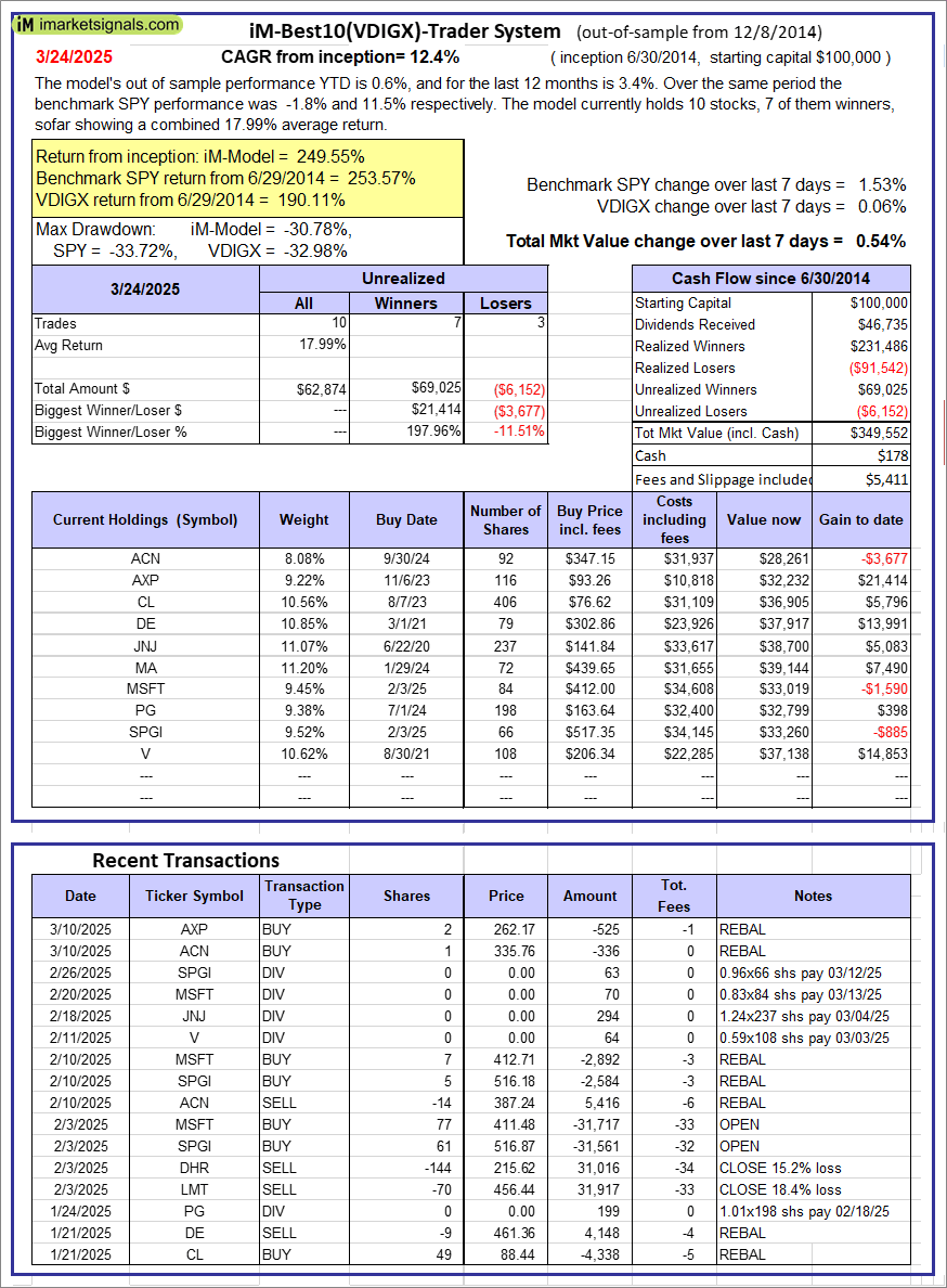 iM-Best10(VDIGX)-Trader: The model’s out of sample performance YTD is 0.6%, and for the last 12 months is 3.4%. Over the same period the benchmark SPY performance was -1.8% and 11.5% respectively. Since inception, on 7/1/2014, the model gained 249.55% while the benchmark SPY gained 253.57% and VDIGX gained 190.11% over the same period. Over the previous week the market value of iM-Best10(VDIGX) gained 0.54% at a time when SPY gained 1.53%. A starting capital of $100,000 at inception on 7/1/2014 would have grown to $349,552 which includes $178 cash and excludes $5,411 spent on fees and slippage. |